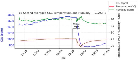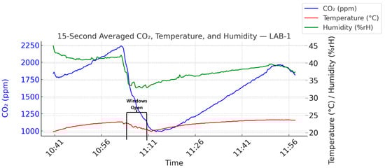 CLASS-1 showed the most effective dynamic response to ventilation, with CO2 dropping from 1708 ppm to 1436 ppm after window opening (p = 4.7 × 10−69, Cohen’s d = 0.82). This condition benefited from a corner layout and cross-ventilation via windows on two perpendicular walls. Although occupancy was moderately high (70%), the spatial configuration enabled substantial improvement. A minor post-break CO2 rise reflected normal occupant activity. LAB-1 shared a similar trend but with a higher occupancy (93%), leading to faster CO2 accumulation post-break. Still, window opening yielded a meaningful drop from 2049 ppm to 1744 ppm (p = 2.5 × 10−47, Cohen’s d = 0.65). Notably, humidity dropped significantly (Cohen’s d = 1.2), underscoring the strong drying effect of ventilation.