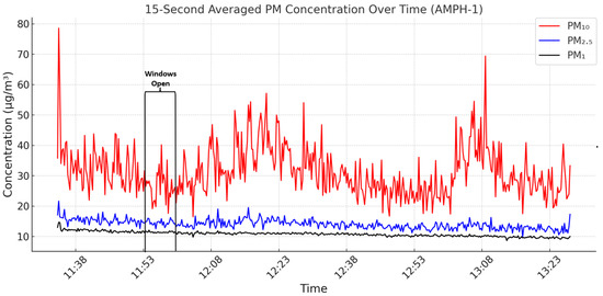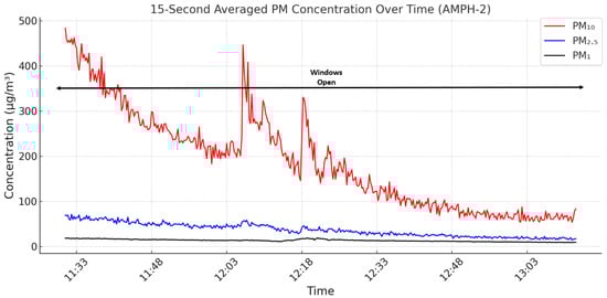 PM concentration trends across experimental conditions varied due to room use, ventilation, occupancy, and surface materials. In AMPH-1, PM levels remained mostly within permissible limits, with occasional PM10 exceedances. Statistically significant reductions were observed when windows were opened—PM10 dropped from 34.94 to 27.75 µg/m3 (p = 1.8 × 10−6, d = 0.51), PM2.5 from 15.78 to 14.61 µg/m3 (p = 1.0 × 10−5, d = 0.47), and PM1 from 12.24 to 11.45 µg/m3 (p = 2.0 × 10−11, d = 0.76)—reflecting moderate ventilation impact despite spatial limitations. In AMPH-2, although PM showed a decreasing trend, values were significantly above limits: medians reached 176.5 µg/m3 for PM10 (p = 2.3 × 10−168), 35.2 for PM2.5 (p = 4.5 × 10−142), and 13.6 for PM1 (p = 3.4 × 10−156). The extreme pollution levels and the pronounced difference between PM10 and smaller particle sizes are likely due to dust-trapping carpet over wood flooring, which released coarse particles during occupant movement [45,46,47], overwhelming the benefits of good window positioning.