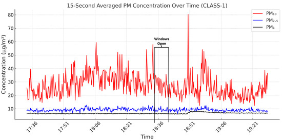 Particulate matter (PM) is a key component of indoor air pollution and is commonly classified based on aerodynamic diameter: PM1 (particles smaller than 1 µm), PM2.5 (smaller than 2.5 µm), and PM10 (smaller than 10 µm). These particles can infiltrate deep into the respiratory tract, with finer particles reaching the alveolar region, thereby posing significant health risks. PM2.5 exacerbates conditions such as asthma and other respiratory diseases, with prolonged exposure linked to severe outcomes, including cardiovascular disease [6,7,8,9,10]. The accumulation of PM in classrooms, where ventilation may be inadequate, poses significant health risks [11,12,13,14,15].