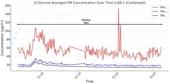 LAB-1 exhibited higher PM levels than CLASS-1, driven by increased occupancy and an incidental chalk dust release. PM10 averaged 53.83 µg/m3 (p = 1.71 × 10−4, d = 0.17), slightly above the 50 µg/m3 baseline. PM2.5 showed a marginal increase (20.52 µg/m3; p = 2.89 × 10−3, d = 0.13), but PM1 was substantially elevated at 15.83 µg/m3 (p = 2.98 × 10−179, d = 1.97), indicating strong impact from fine particles, likely exacerbated by both occupant activity [49] and outdoor PM infiltration during the open-window period.