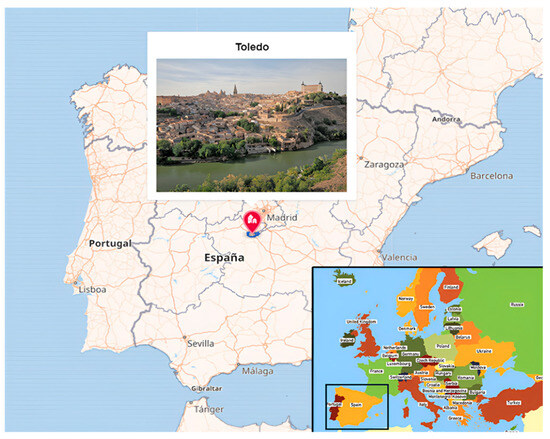 Toledo, located in central Spain (39°51′ N, 4°01′ W), has a population of 86.070 inhabitants and features a flat terrain with uniform vegetation (Figure 1). It is 529 m above sea level, surrounded by the Tagus River, and belongs to the Autonomous Community of Castilla-La Mancha. This area has a dry continental climate, with an average annual temperature of 15.8 °C and an average annual rainfall of 342 mm.