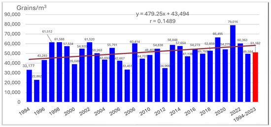 Average annual concentrations of total pollen in Toledo (1994–2023).