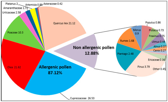 A total of 20 different pollen taxa were collected, with pollen from Cupressaceae species being the most prevalent at 26.53% of the total (peak day, 26 January 2014, with 3.734 grains/m3), followed by Olea europaea at 21.62% (peak 30 May 1999, 5.064 grains/m3), Quercus spp. at 21.12% (peak 28 April 2002, 3.486 grains/m3), Poaceae at 10.30% (peak 18 May 2003, 1320 grains/m3), Pinus spp at 3.79% (peak 17 June 2018), Urticaceae at 2.58% (peak 8 March 2017, 452 grains/m3), Plantago spp. at 2.48% (peak 24 May 2008, 210 grains/m3), Platanus spp. at 2.00% (peak 8 April 2018, 668 grains/m3), Amaranthaceae at 1.72% (peak 2 September 2007, 62 grains/m3), Rumex spp. at 1.68% (peak 10 June 1998, 164 grains/m3), Morus spp. at 0.90% (peak 7 April 1999, 216 grains/m3), Pistacia spp. at 0.73% (peak 6 April 2001, 401 grains/m3), Populus spp. at 0.86% (peak 20 February 2020, 112 grains/m3), Artemisia spp. at 0.83% (peak 13 November 1998, 92 grains/m3), Fraxinus spp. at 0.75% (peak 2 February 2016, 92 grains/m3), Ulmus spp. at 0.44% (peak 9 February 2019, 84 grains/m3), Asteraceae (non-Artemisia) at 0.42% (peak 20 May 2000, 72 grains/m3), Alnus spp. at 0.37% (peak 26 January 2013, 124 grains/m3), Carex spp. at 0.27% (peak 28 May 1995, 44 grains/m3), Ericaceae at 0.16% (peak 9 May 2021, 34 grains/m3) and other pollen at 0.45% (Figure 3).