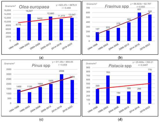 To reduce the interannual variability of pollen from 1994 to 2023 in Toledo, the concentrations were grouped into 5-year periods, showing a tendency to increase over time. The concentrations for almost all types of pollen, including the total pollen concentration, increased; some of them nearly doubled, such as for Olea europaea, Fraxinus, Pinus, and Pistacia spp. pollen and Alternaria spores, while others, such as Platanus spp., quadrupled (Figure 4).
