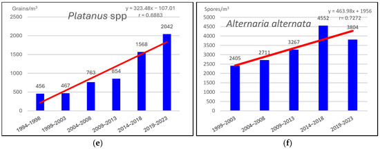 Highly positive correlations between 1994 and 2023 were found for Fraxinus spp. (r = 0.950), Platanus spp. (r = 0.947), and Cupressaceae (r = 0.922) pollen and Alternaria spores (r = 0.959), positive correlations were found for Plantago spp. (r = 0.628) and Urticaceae (r = 0.611), and highly negative correlations were found for Carex spp. (r = −0.991), Amaranthaceae (r = −0.891), Quercus spp. (r = −0.853), and Artemisia spp. (r = −0.623) pollen.