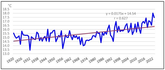 An analysis of the average annual temperature data from 1994 to 2023 revealed an increase of 1.2 °C from 16.3 °C to 17.5 °C, with an average of 16.4 °C, whereas the average from 1920 to 1993 was 15.1 °C. Therefore, in the last 30 years, the average temperature in Toledo has increased by 1.3 °C with respect to the average of the previous 74 years (Figure 5).