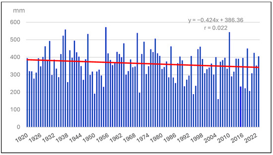 The mean total precipitation from 1920 to 2023 was 364.1 mm, with a standard deviation of ± 86.2 mm. The highest accumulated annual precipitation occurred in 1955, at 571.3 mm, and the lowest occurred in 2005, at 159.6 mm (Figure 6). The mean total precipitation from 1994 to 2023 was 344.25 mm, with a standard deviation of ± 177.1 mm.