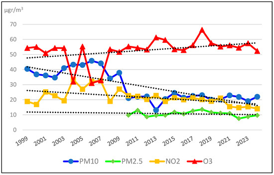 The mean annual concentration of particulate matter 10 (PM10) decreased from 40.45 µgr/m3 in 1999 to 19.08 µgr/m3 in 2023. The concentration of PM2.5 declined from 9.79 µgr/m3 in 2010 to 8.73 µgr/m3 in 2023. Similarly, NO2 levels decreased from 18.87 µgr/m3 in 1999 to 15.38 µgr/m3 in 2023. In contrast, ozone levels slightly increased from 54.3 µgr/m3 in 1999 to 57.46 µgr/m3 in 2023 (Figure 7).