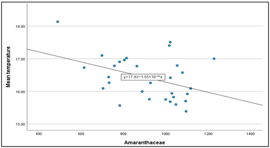 Temperature was significantly positively correlated with Olea and Poaceae pollen and Alternaria spores, and negatively correlated with Cupressaceae pollen (Table 3A,B). Amaranthaceae was strongly negatively correlated with mean temperature in August (r = 0.684) (Figure 8).
