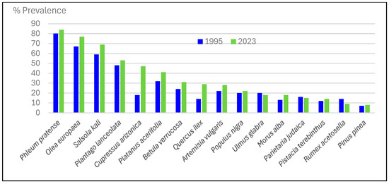 The greatest increase was observed in allergic sensitization: the abundance of Cupressus arizonica increased from 18% to 47% between 1995 and 2023. Phleum pratense remained the most prevalent allergen (84%), followed by Olea europaea (77%) and Salsola kali (69%).