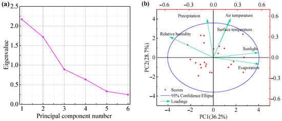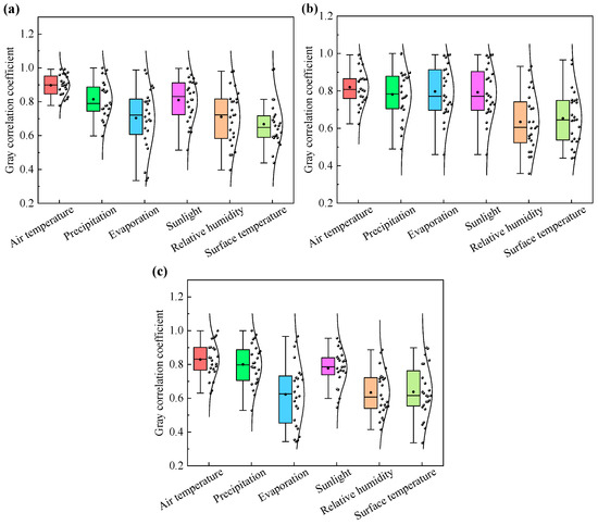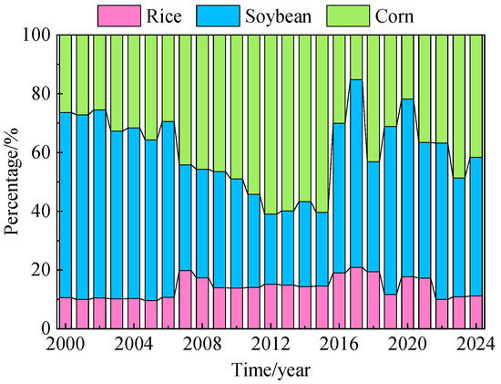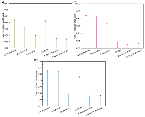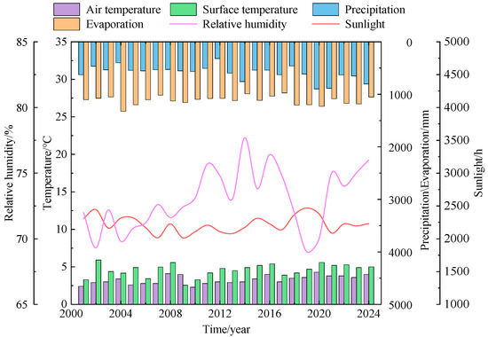 - Trend characteristics: Among the six meteorological variables, only precipitation showed a statistically significant increasing trend. Air temperature, surface temperature, and relative humidity exhibited nonsignificant upward trends, while evaporation and sunlight duration declined slightly without significance. The crop yields for rice, soybean, and corn also showed overall upward trends, but none were statistically significant.