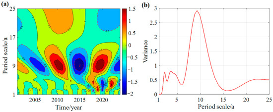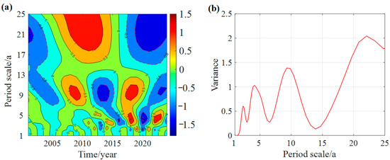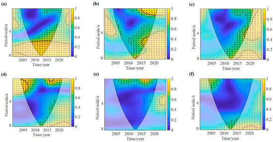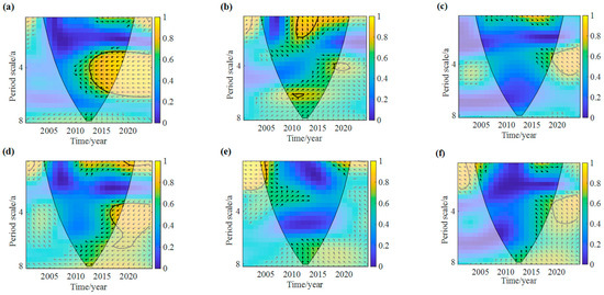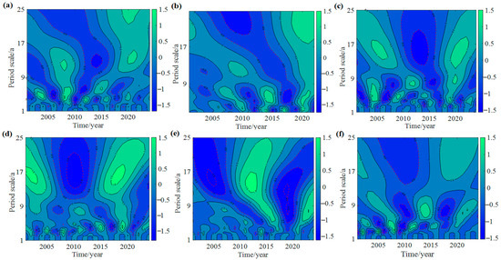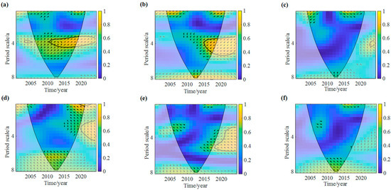 - Periodic coherence: Both meteorological factors and crop yields exhibited dominant periodicities of around 22 and 8 years. These shared cycles revealed strong multi-scale time–frequency coherence, indicating that climate variability plays a long-term regulatory role in agricultural production.