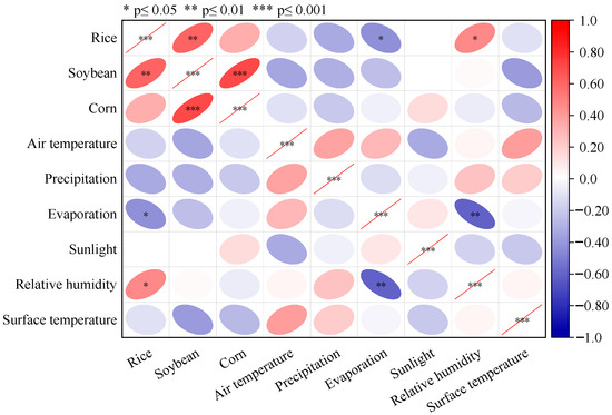 3.3. Crop and Meteorological Factor Correlation Analysis