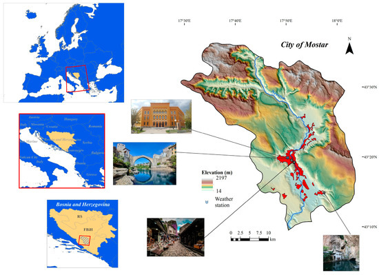 One of the greatest challenges contemporary tourism faces is the ever more frequent and intensive extreme weather events, such as heat waves, cold spells, storms, and other natural hazards, as stated in a report by the World Meteorological Organization [1]: “Climate indicators set new records. Extreme events cause devastation” [1]. These events negatively affect tourism infrastructure and endanger natural and cultural resources as well as having the capacity to cause fires, erosion, or transportation disruptions, which impacts the safety and reputation of destinations [2]. Although heat waves are not globally recognized as the most dangerous type of weather hazard compared to hurricanes or storms, they are to a growing extent becoming a threat regarding local areas, especially in the Mediterranean region [3]. Such trends highlight the need for the development of sustainable spatial planning that integrates tourism, climate resilience, and environmental protection [4]. According to earlier reports by the World Tourism Organization [5,6], the Mediterranean region—geographically including the city of Mostar—represents the world’s leading tourist destination, attracting one-fifth of all international arrivals and generating over 30% of global tourism revenue. However, climate change threatens this potential, as earlier reports by the Intergovernmental Panel on Climate Change [7] already warned of rising temperatures and more frequent heat waves. Recent IPCC reports [8,9] confirm that the predictions made in 2007 about rising temperatures and increasing heat waves have nearly been fulfilled. “Climate Change 2021: The Physical Science Basis” and “Climate Change 2024: Synthesis Report” both highlight that extreme heat events have become more frequent and intense, in line with earlier projections [8,9].