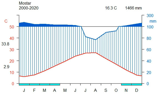 Walter-Lieth climate diagram for Mostar for the period 2000–2020. The left y-axis (in red) shows the average monthly air temperatures. The right y-axis (blue color) shows the monthly precipitation in totals, while blue bar lines illustrate the amount of precipitation per month. On the left axis, values in black represent the mean daily maximum and mean daily minimum temperature along the whole period. At the top right, values in black represent the averaged value of mean temperature and annual precipitation along the whole period.
