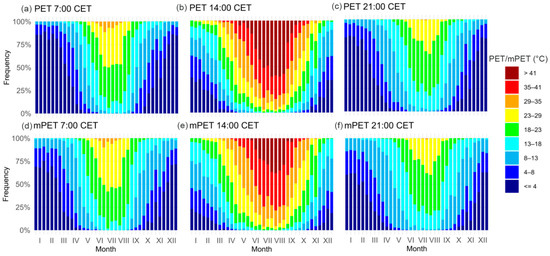 The daily distribution of PET and mPET presented in Figure 5 identifies intervals of heat stress from morning through evening, evaluating 10-day intervals within the observed years at the same time. Figure 5 shows that the warmest days and hours were recorded in July and August between 12:00 CET and 16:00 CET when PET and mPET levels go beyond 35 °C. Hot conditions reach 35 °C from mid-June to late August during the day, while stress above 41 °C is only present in August around 14:00 CET (according to PET). From June to the end of August, mornings and evenings are often comfortable or may induce slight heat stress, with no expectation of cold stress at all. PET and mPET categories below 13 °C occur in the mornings and evenings from late September until early May, and they are present during the day from early November until late March.