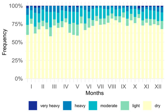 Diagram of average frequency classes of daily precipitation amounts at 10-day resolution throughout the year in Mostar (2000–2020).