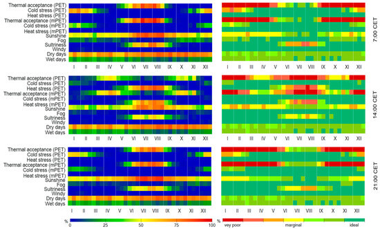 Climate-Tourism Information Scheme (CTIS) for Mostar (2000–2020) at 07:00, 14:00, and 21:00 CET. The left-hand graphs show the frequency distribution of thermal comfort categories and weather-related conditions expressed as percentages for 10-day intervals throughout the year. The right-hand graphs illustrate the degree of suitability of these conditions for tourism, classified into three categories: very poor, marginal, and ideal.