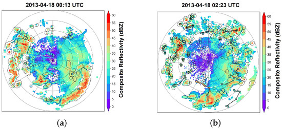 The parameters to identify the convective cells, such as the background radius, radar reflectivity differences between grid points and the background, and reflectivity thresholds are determined by the data resolution and the characteristics of the convective cells under investigation. Studies have shown that this method of identifying convective cells works well in various conditions, including shallow and isolated cells, intense deep convection, and organized convective clusters embedded in mesoscale convective systems (MCS) with broad stratiform rain areas [30]. The method can distinguish weak and intense cells, preventing contamination from powerful bright bands associated with MCS stratiform rain. The identification of the cells from the radar data can be seen in Figure 2a.