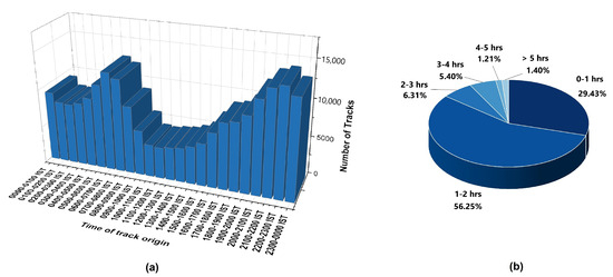 Various parameters, such as cell initiation times and the lifetime of individual cells, maximum cell convective area, maximum reflectivity in the cells, and echo top heights for 20 dbZ and 50 dbZ, are obtained from the radar data from 2013 to 2018 for the individual cell tracks. A total of 211,503 individual tracks are identified in the six years. The number of tracks that start within each hour of the 24 h (local time) across the day is given in Figure 3a which shows the convection initiation time as a track is identified only if it has a core convective area. The lifetime of all the individual tracks in hours is shown in Figure 3b which is determined by tracking the cell mask across the timeline. The box plot with outliers removed of the cell’s maximum area, cell’s maximum reflectivity, and echo top heights for 20 dBZ and 50 dBZ observed from all the tracks for each of the 24 h a day is shown in Figure 4 and Figure 5 at local time to understand the diurnal variability of the parameters.