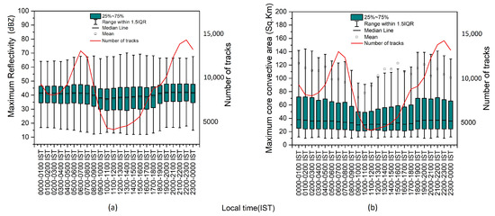 Box plot of (a) Maximum reflectivity of cells for different hours of the day. (b) Maximum core convective area for different hours of the day.