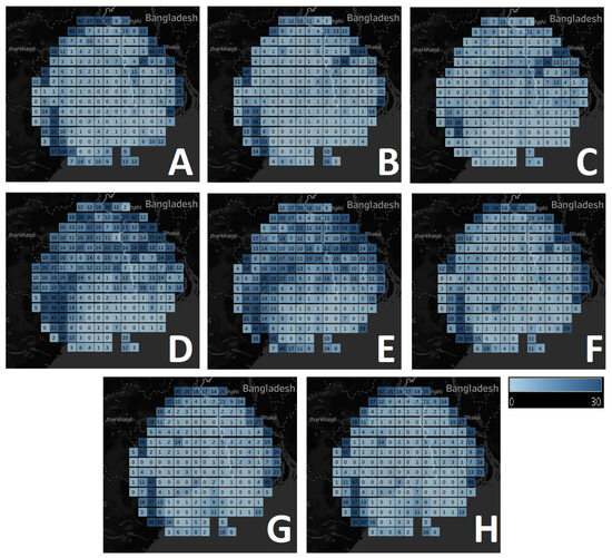 Lightning threshold exceedance numbers distribution in the study area for different daily hours: (A) 05:30 IST to 08:30 IST, (B) 08:30 IST to 11:30 IST, (C) 11:30 IST to 14:30 IST, (D) 14:30 IST to 17:30 IST, (E) 17:30 IST to 20:30 IST, (F) 20:30 IST to 23:30 IST, (G) 23:30 IST to 02:30 IST, (H) 02:30 IST to 05:30 IST.