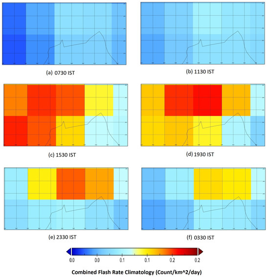Combined flash rate climatology of 2014 (March to May) over Gangetic West Bengal: (a) 07:30 IST, (b) 11:30 IST, (c) 15:30 IST, (d) 19:30 IST, (e) 23:30 IST, (f) 03:30 IST.