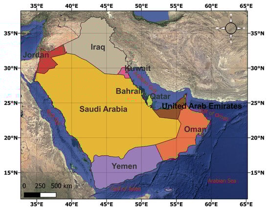 The Arabian Peninsula consists of six countries, with parts of three additional countries extending onto it. The nations on the peninsula include Saudi Arabia, Oman, Kuwait, Qatar, Yemen, and the UAE. The southern areas of Jordan, Iraq, and Bahrain are also geopolitically associated with the peninsula [26,40]. The area encounters significant environmental challenges such as desertification, climate change, and declining AQ [26,29,40]. The region’s AQ is affected by natural factors (i.e., desert dust) and human activities (i.e., emissions from vehicles and industries). These activities encompass the rapidly expanding urban population, which leads to higher vehicle usage and emissions, industrialization, construction, emissions from ships in the Arabian Gulf, and the exploitation of natural resources [26,29,40]. These combined factors negatively affect AQ in the region, posing long-term public health and environmental sustainability concerns.