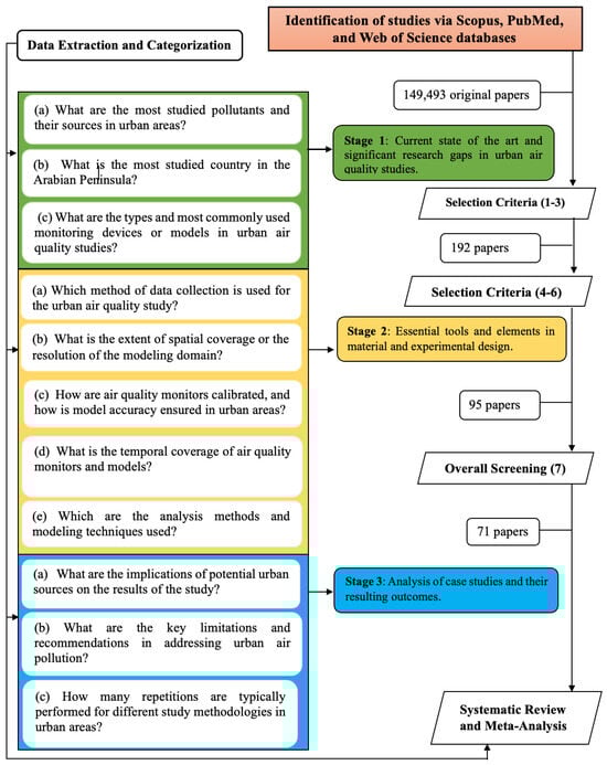 In this paper, we performed a systematic review and meta-analysis of urban AQ studies to address the current state of the art, identify significant gaps, evaluate essential tools and elements in materials and experimental design, and analyze case studies and their outcomes in the Arabian Peninsula. A summary is provided below: