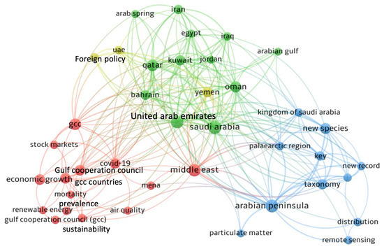 To gather the datasets for this study, we primarily utilized the Web of Science (WoS) and searched for peer-reviewed articles containing specific keyword terms, including “urban air quality”, “urban air pollution”, “Arabian Peninsula”, “Gulf countries”, “Bahrain”, “Kuwait”, “Iraq”, “Oman”, “Qatar”, “Saudi Arabia”, “United Arab Emirates”, “Yemen”, and “Jordan”. The representative connection network based on all keywords from the consulted review papers is presented in Figure 3. It is crucial to highlight the following: (1) This systematic review specifically targets research on urban AQ within the Arabian Peninsula, encompassing both qualitative and quantitative full-length original research articles, as well as academic reviews, theoretical discussions, and case studies indexed in the WoS. (2) We excluded non-peer-reviewed materials such as reports from government bodies, organizations, newspapers, media outlets, and other online sources. The database of papers was reviewed multiple times to avoid repetitions or duplicates. The following inclusion criteria were adopted for selecting the papers: