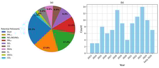 During our review and meta-analysis, we compiled air pollutant data (Figure 4a) from studies published between 2013 and early (June) 2025 (Figure 4b). The analysis highlighted AQ concerns in the Arabian Peninsula. These results indicated that dust, NOx, and particulate matter (PM) remain the most studied pollutants in the Arabian Peninsula, reflecting ongoing concerns regarding AQ management.
