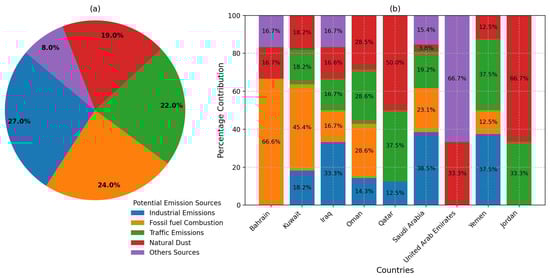 This study highlighted the significant influence of various urban sources on AQ outcomes in the Arabian Peninsula. The analysis of the potential emission sources of air pollutants in the Arabian Peninsula, as presented in Figure 5a, revealed several key findings. Industrial emissions are the most frequent source, with 19 occurrences (27%), underscoring the significant role of industrial activities such as petrochemical plants, oil refineries, and cement industries in contributing to regional air pollution. These findings reflect the need for enhanced regulatory measures and pollution control technologies to mitigate the impact of industrial activities on the region’s AQ [32,63,68,80].