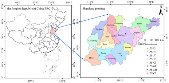 There are eight civil aviation airports in Shandong Province (see Figure 1), including Jinan Yaoqiang International Airport (ZSJN), Jining Qufu Airport (ZSJG), Linyi Qiyang Airport (ZSLY), Weifang Nanyuan Airport (ZSWF), Rizhao Shanzihe Airport (ZSRZ), Yantai Penglai International Airport (ZSYT), Qingdao Liuting International Airport (ZSQD), and Weihai Dashuibo International Airport (ZSWH).