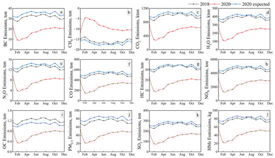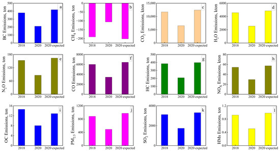 Annual civil aviation emissions in 2018, 2020, and 2020 (expected) ((a–l) represent the emissions of BC, CH4, CO2, H2O, N2O, CO, HC, NOX, OC, PM2.5, SO2, and HMS, respectively).