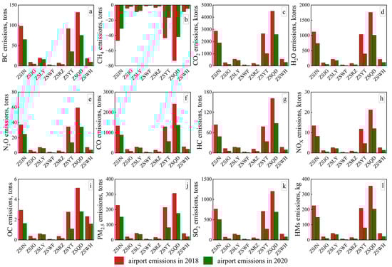 Emissions from the eight airports of Shandong in 2018 and 2020 ((a–l) represent the emissions of BC, CH4, CO2, H2O, N2O, CO, HC, NOX, OC, PM2.5, SO2, and HMS, respectively).