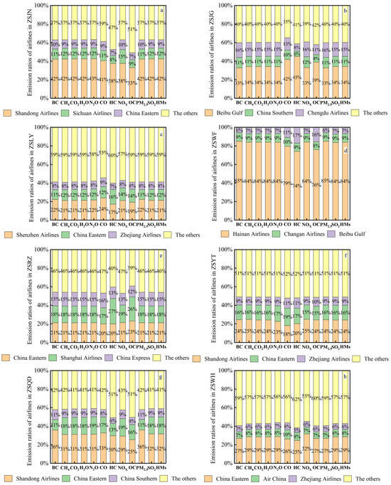Emission contributions of primary airlines in the eight airports of Shandong, 2018 ((a–h) represent ZSJN, ZSJG, ZSLY, ZSWF, ZSRZ, ZSYT, ZSQD, and ZSWH, respectively).