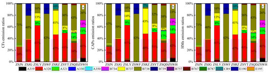 Shares of CFs, CAPs, and HMs emissions for different aircraft types in 2020 ((a–c) represent CFs, CAPs, and HMs, respectively).