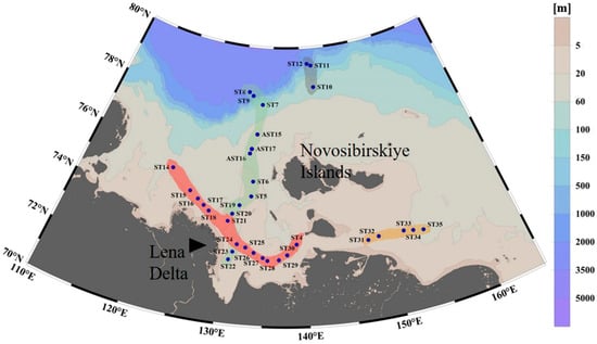 The distribution of CTD measurement stations in the Laptev Sea during the summer of 2018. Data collection was conducted at each station using an SBE-19plus V2 CTD. The light green, gray, red, and orange areas represent Section 1, Section 2, Section 3 and Section 4, respectively. The background colors indicate bathymetry.