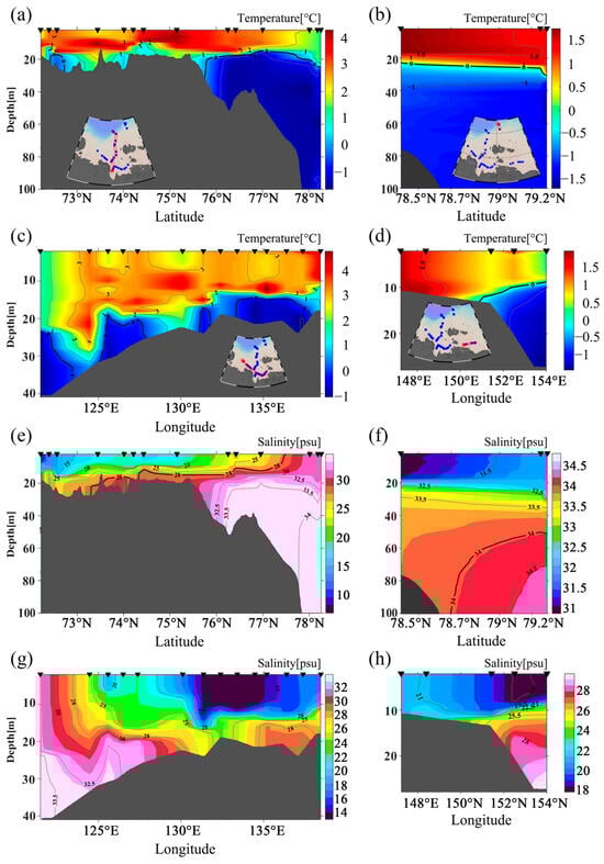 The temperature and salinity profiles for Section 1, Section 2, Section 3 and Section 4, where (a–d) represent the temperature of Section 1, Section 2, Section 3 and Section 4, and (e–h) represent the salinity of Section 1, Section 2, Section 3 and Section 4. The small maps in (a–d) display the specific geographical locations of Section 1, Section 2, Section 3 and Section 4; the black triangles at the top of each picture indicate the station positions of each section.