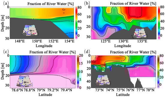 The proportion of freshwater runoff inside the mixed layer, including (a) Section 4, (b) Section 3, (c) Section 2, and (d) Section 1. The small maps display the specific geographical locations of Section 1, Section 2, Section 3 and Section 4; the black triangles at the top of each picture indicate the station positions of each section.