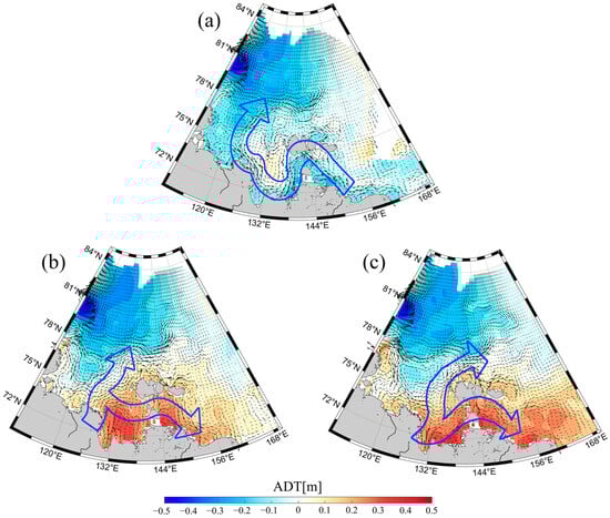 Monthly average surface-current distribution in the summer of 2018, with ADT distribution denoted by the background color, for (a) August, (b) September, and (c) October. The blue box-shaped arrows in the three pictures are all used to indicate the general direction of ocean currents.