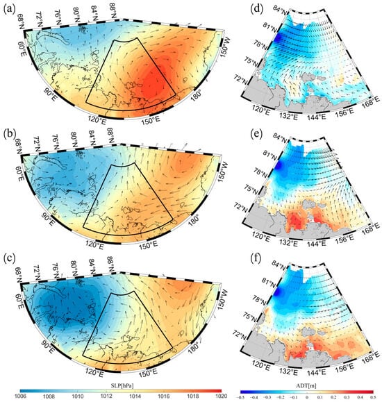 Our study argues that the phenomenon of the ADT maximum observed near the Laptev Sea–East Siberian Sea coast in the summer of 2018 is due to the influence of wind. During August 2018, the Beaufort High was centered east of the Novosibirskiye Islands, straddling the Laptev Sea–East Siberian Sea. This configuration generated an anticyclonic wind pattern across the region, with prevailing southeast winds over the study area. Wind stress drove the Ekman transport of shelf waters toward the continental slope (Figure 5a,d), preventing shelf-water accumulation. However, from September to October, as the Beaufort High rapidly retreated eastward into the Canada Basin, a low-pressure system from the Eurasian Basin occupied the Kara Sea. Consequently, the wind over the Laptev Sea–East Siberian Sea transitioned to a cyclonic pattern characterized by strong westerly winds along the Laptev Sea–East Siberian Sea coast. These winds drove the accumulation of shelf water toward the coast, resulting in the formation of an ADT maximum in the coastal area (Figure 5b,c,e,f). The maximum ADT distributed along the coastline increased the radial sea-surface height gradient from the inner shelf to the outer shelf, which enhanced the eastward coastal current. This dynamic mechanism played a critical role in facilitating the eastward transport of coastal freshwater runoff into the Canada Basin.