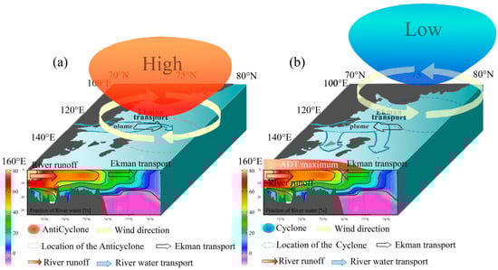 The variations in Ekman transport near the river estuary and the formation mechanism of the ADT maximum during August–October 2018 in summer. (a) In August, when the Beaufort High center was located over the Novosibirskiye Islands, the prevailing wind over the Laptev Sea blew westward, generating mainly northward Ekman transport. (b) From September to October, as the Beaufort High center moved toward the Canadian Basin, the wind over the Laptev Sea changed from high-pressure to low-pressure dominance, with the prevailing wind turning northeastward. This move induced mainly southward Ekman transport, while increased river runoff introduced additional water to the area. These combined effects led to water accumulation in the region, manifesting as an ADT maximum in the figure.