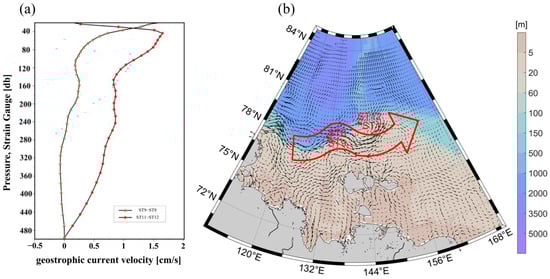 In addition to the eastward coastal current, a weaker northeastward shelf circulation transports shelf-derived freshwater toward the continental slope north of the Novosibirskiye Islands (Figure 4b,c). Observations reveal, however, that this freshwater pathway is constrained by the steep salinity gradients at the shelf-break zone upon reaching the shelf edge. Consequently, the freshwater largely follows the eastward-flowing circumpolar boundary current along the slope rather than entering the deep basin (Figure 3a and Figure 4). Dynamic height–gradient calculations across transects ST8–ST9 (Section 1) and ST11–ST12 (Section 2) confirm the presence of slope-confined geostrophic currents that restrict freshwater intrusion into the deep basin. In Section 1, geostrophic currents are limited to the upper 80 m, while in Section 2, they extend below 300 m, with maximum relative velocities of ~0.015 m/s (Figure 7a). These findings align with the eastward geostrophic slope current proposed by the previous study []. A reanalysis of the data further corroborates that a northeastward surface geostrophic current persisted in the 77° N–79° N slope region during the summer of 2018 (Figure 7b). Its spatial structure matches observational results: stronger near-surface currents near Section 1 and weaker velocities in Section 2, consistent with the depth-dependent velocity differences (<40 m) inferred from dynamic height gradients.