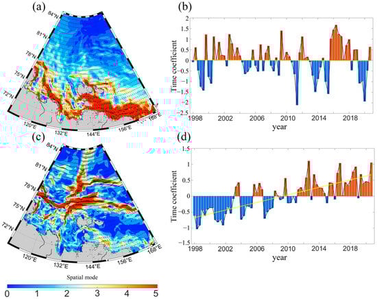 Spatial modes and temporal coefficients of summer (1998–2020) surface-circulation dynamics in the Laptev Sea–East Siberian Sea derived from vector EOF analysis. Panels (a,b) illustrate the spatial pattern and corresponding temporal coefficient series of the first EOF mode, respectively, while panels (c,d) depict those of the second EOF mode.