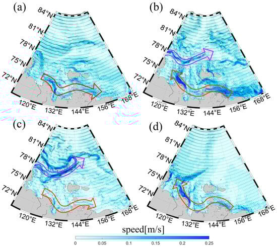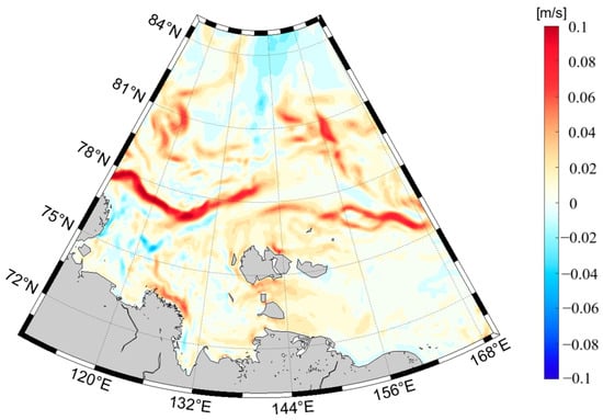 As illustrated in Section 3.2, there are two principal transport pathways for freshwater runoff from the Laptev Sea to the East Siberian Sea: a coastal eastward route traversing through straits into the East Siberian Sea, and a northern route that, upon reaching the continental-slope region, subsequently follows the shelf edge eastward under geostrophic current forcing. The scarcity of in situ observational data in the Laptev Sea–East Siberian Sea, particularly the absence of direct velocity measurements, poses significant challenges to elucidating the structural characteristics of regional circulation patterns. To address these observational limitations, this study employs satellite-derived Arctic circulation datasets (GLORYS12V1) retrieved through remote sensing inversion techniques, enabling a comprehensive investigation into the spatial–temporal distribution characteristics of surface-current variability within this marine domain over a 23-year period (1998–2020).
