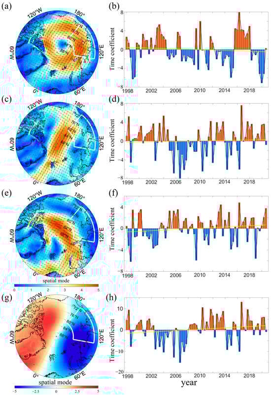 Illustration of the spatial-mode distributions and temporal coefficients of summer Arctic sea-surface winds derived from vector EOF analysis during 1998–2020, with panels (a,b) representing the spatial pattern and temporal coefficient of the first EOF mode, (c,d) representing the second mode, and (e,f) representing the third mode. And (g,h) representing the spatial pattern and temporal coefficient of AD. White dashed rectangles demarcate the geographical extent of the Laptev Sea–East Siberian Sea region.