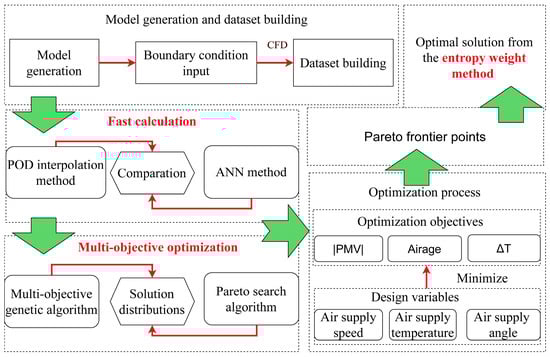 In the model generation and dataset building stage, the geometry and mesh of the aircraft cabin were generated, and different air supply boundary conditions within the design range were defined. Subsequently, after validation with the experimental data in the literature, various cases under different boundary conditions were conducted using CFD simulation. These simulations built the dataset required for the fast calculation model training. For the fast calculation stage, two fast calculation methods (POD and ANN) were employed to calculate the optimization objectives under any boundary conditions within the design range. Their relative errors were compared, and the more accurate method was selected for subsequent optimization.