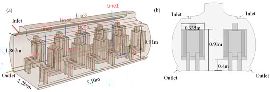 Since supersonic airliners currently in service are relatively scarce, it is not feasible to perform experimental validation specifically for supersonic aircraft cabins. Therefore, experimental data from conventional aircraft cabins reported in the literature were employed to validate the numerical model. Figure 5a illustrates the measurement section of the aircraft cabin, while Figure 5b presents a comparison between the predicted velocity field computed using the RNG k-ε turbulence model and experimental velocity field obtained via particle image velocimetry (PIV). Detailed descriptions of the experimental setup and numerical configurations can be found in Li et al. [] and Li et al. [], respectively. As shown in Figure 5b, the RNG k-ε model effectively captures the main flow features observed in the PIV measurements. Specifically, the airflow jets from the two side diffusers converge near the cabin centerline, and lower velocity magnitudes are observed near the ceiling and sidewall regions. Therefore, the RNG k-ε model can be used for numerical simulation in this study.