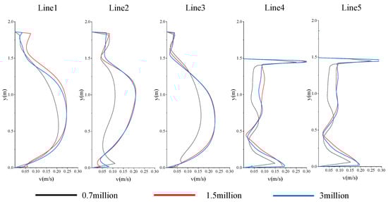 To determine the appropriate mesh density for the cabin simulation, three different mesh resolutions—0.6 million, 1.5 million, and 3 million mesh grids—were employed for mesh independence verification. During the meshing process, the grid resolution was refined in key areas, including the diffuser, outlet, and human models. Once the grids were defined, the simulation results for airflow velocity at five locations were compared across the three mesh cases, as shown in Figure 4. Lines 1, 2, and 3 are positioned in the middle of the aisle, while Lines 4 and 5 are located in the narrower region in front of the third row of passengers (Figure 3). As the grid density increases, the airflow velocity for the 1.5 million and 3 million grids follows similar trends; however, slight differences in velocity values are observed at Line 1 and Line 4 between the 1.5 million and 3 million grids. Overall, we conclude that the 1.5 million grid satisfies the mesh independence criteria and was selected for the subsequent calculations.